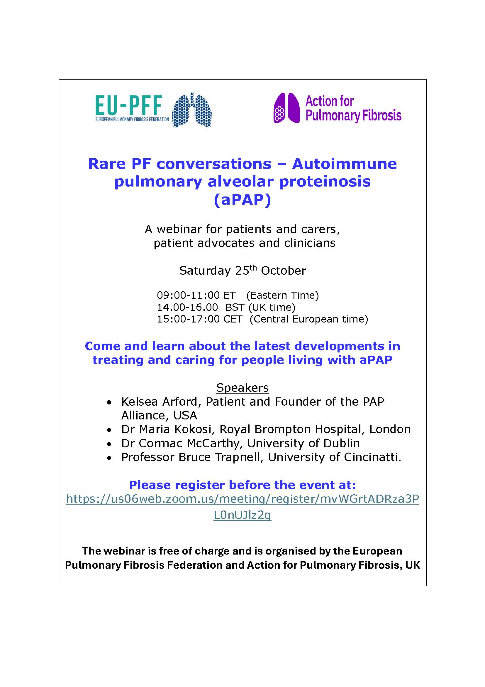 EU-PFF and APF are jointly organizing a 2-hour webinar on autoimmune pulmonary alveolar proteinosis (aPAP) on Saturday, October 25 from 9:00-11:00 a.m. Eastern Time.
